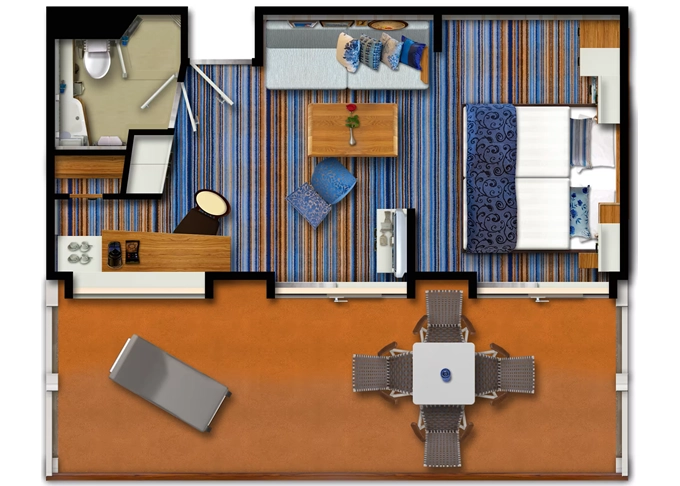 | SUTO - Themen Suite 54 m² + balkón 15 m² so stolom, ležadlom a hojdacou sieťou. Spálňa, obývacia časť, šatník. 10. paluba. Max 4 osoby. Výhody Suite. | 9 528 € 3 176 € za osobu | ||
