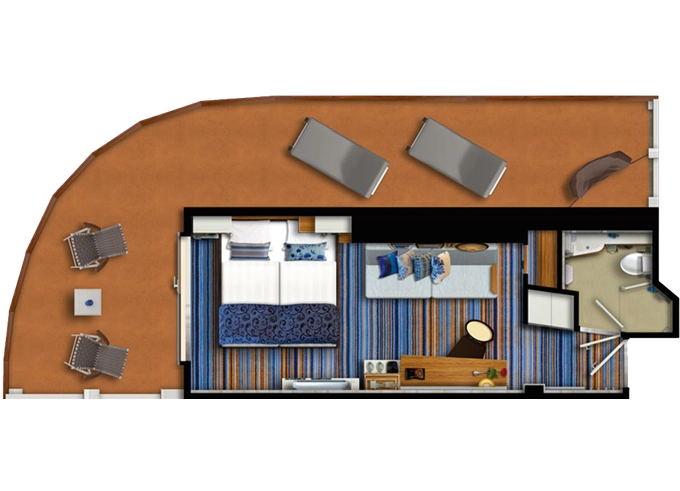 | VEPO - Kajuta s terasou Premium 17 m² + balkón 30 m² s 2 kreslami, 2 ležadlami a hojdacou sieťou. 7-11. paluba. Max 3 osoby. | 4 238 € 2 119 € za osobu | ||