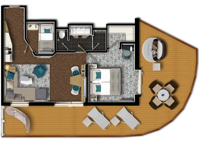 | SUDO - Diamant Suite 42 m² + balkón 47 m² so stolom so 4 stoličkami, s hojdacou sieťou, 2 ležadlami a posteľou Sun island. Spálňa (manželská posteľ), obývacia izba (rozkladacia pohovka), 2. spálňa (lôžko a vyklápacia posteľ), hracia konzola. 6. paluba. Max 6 osoby. Výhody Suite. | 11 796 € 1 966 € za osobu |
